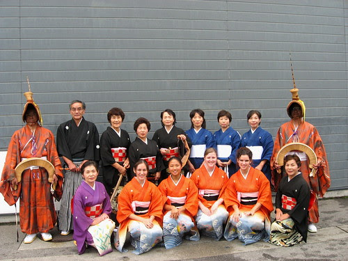 When our time came to perform we went back stage to prep. Our group consisted of 2 singers, 4 musicians, 7 lady dancers and two male. For the first part of the dance the four of us stood at the side and waited for our part to enter. As soon as we entered the dance all the news cameras turned on and the whole audience ooohed and ahhhed at the gaijin. We were only on stage for maybe a total of 3 min, but all that following week I was approached by coworkers, students, and random strangers commenting on my appearance on TV and in the newspapers. (apparently they did a closeup on my face too :\)